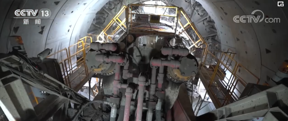 30多分鐘的步行后,我們靠近了隧道施工現場。長達110多米的大型盾構機是開挖隧道的“功臣”,開挖直徑達到9.1米,巨型刀盤后,還有12個電機作為動力支撐系統,保證隧道作業的進度和安全。