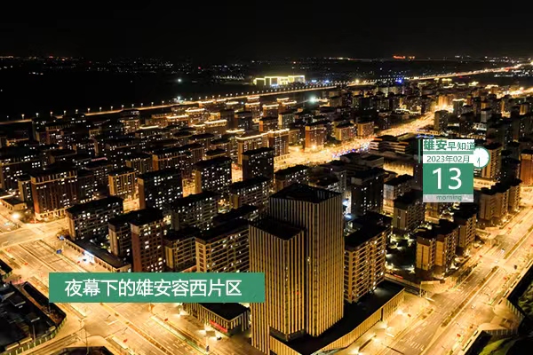 今天是2023年2月13日,星期一,天氣多云轉晴,-7℃~6℃。在封面和大家見面的是夜幕下的雄安容西片區。