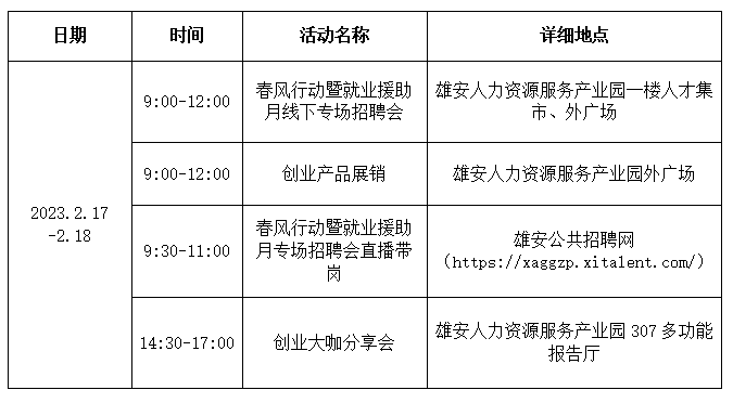 6、2月17日至2月18日,雄安新區(qū)2023年春風(fēng)行動(dòng)暨就業(yè)援助月大型招聘活動(dòng)將在雄安人力資源服務(wù)產(chǎn)業(yè)園人才集市舉辦。活動(dòng)共組織100余家企業(yè),針對高校畢業(yè)生、回遷安置群眾、退役軍人等重點(diǎn)群體提供上千個(gè)崗位,還將同步開展直播帶崗、創(chuàng)業(yè)大咖分享會(huì)、創(chuàng)業(yè)產(chǎn)品展銷等活動(dòng),進(jìn)一步完善就業(yè)創(chuàng)業(yè)服務(wù)。
