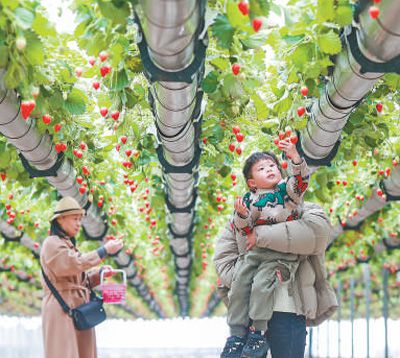 浙江省臺州市黃巖區發展綠色農業,市民在一家草莓栽培基地里摘草莓。