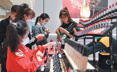 海南省海口市的國際免稅城內,游客在選購免稅商品。