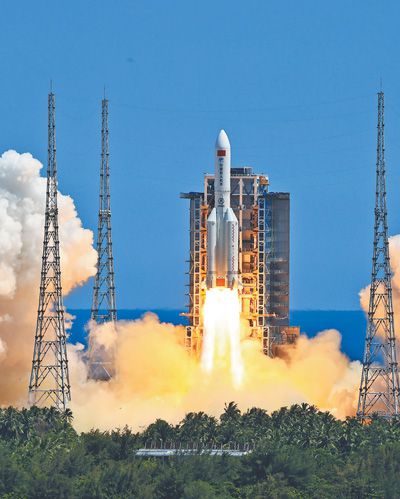 搭載問天實驗艙的長征五號B遙三運載火箭,在海南文昌航天發射場點火發射。