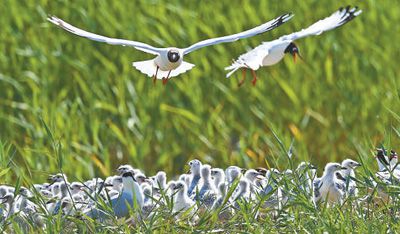 陜西省神木市紅堿淖國家級自然保護區,遺鷗在島上飛翔。