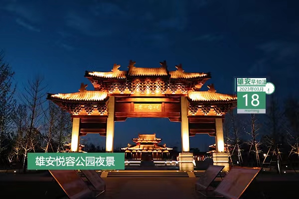 今天是2023年3月18日,星期六,天氣晴轉多云 ,5~15℃。在封面和大家見面的是雄安悅容公園夜景。