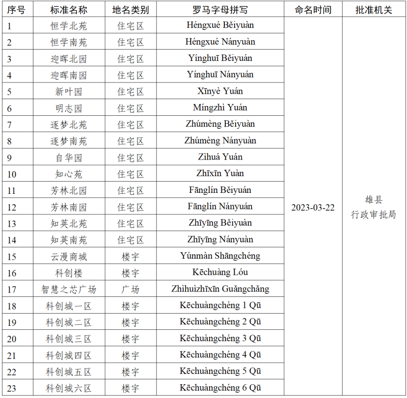 6、根據國務院《地名管理條例》《河北省地名管理規定》《河北雄安新區地名命名規范》等有關規定,昝崗組團“恒學北苑”等23個地名已按有關程序正式命名,現正在公告。