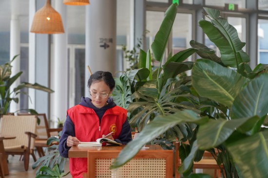 4月19日,浙江省舟山市嵊泗縣菜園鎮基湖農家書屋,志愿者利用空閑時間在書屋里閱讀。人民網 章勇濤攝