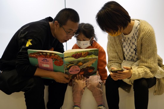 4月15日,青海西寧,家長正在給孩子講解圖書內容。人民網 況玉攝