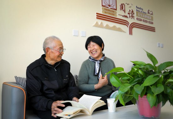 4月18日,在雄安新區容西片區首家養老驛站,78歲的吳山坡(左)老人正與老伴兒在閱覽室里聊天。人民網 宋燁文攝