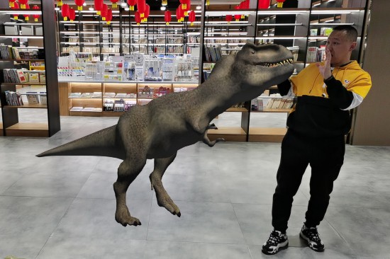 4月21日,在長春市綠園區圖書館七彩書局分館,工作人員正在向市民展示“動態閱讀”的樂趣。“動態閱讀”通過AR技術實現人與動物的合影,同時,可以閱讀電子書,了解相關的動物知識。人民網記者 王帝元攝