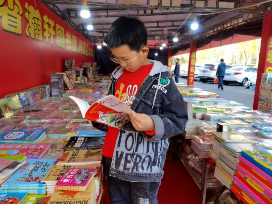 4月19日,在吉林長春一商場門口的圖書展攤位前,一名五年級小朋友拿著一本愛國教育紅色故事讀物,津津有味地讀了起來。人民網 王海躍攝