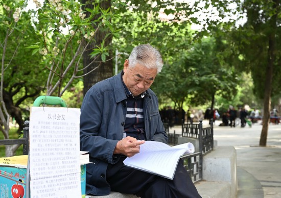4月16日,鄭州人民公園,退休警官趙萬清在閱讀自己的作品,他已經出版了幾十萬字的回憶錄和散文集,平時在公園讀讀書,和愛書的朋友聊聊天,成了老人退休生活的主色調。人民網記者 王玉興攝