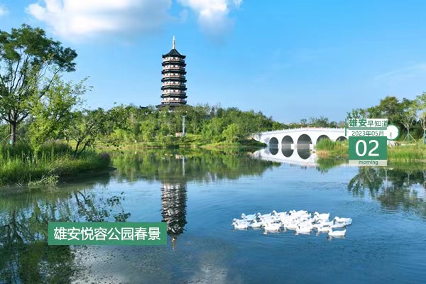 今天是2023年5月2日,星期二,天氣晴轉多云,16℃~28℃。在封面和大家見面的是雄安悅容公園春景。