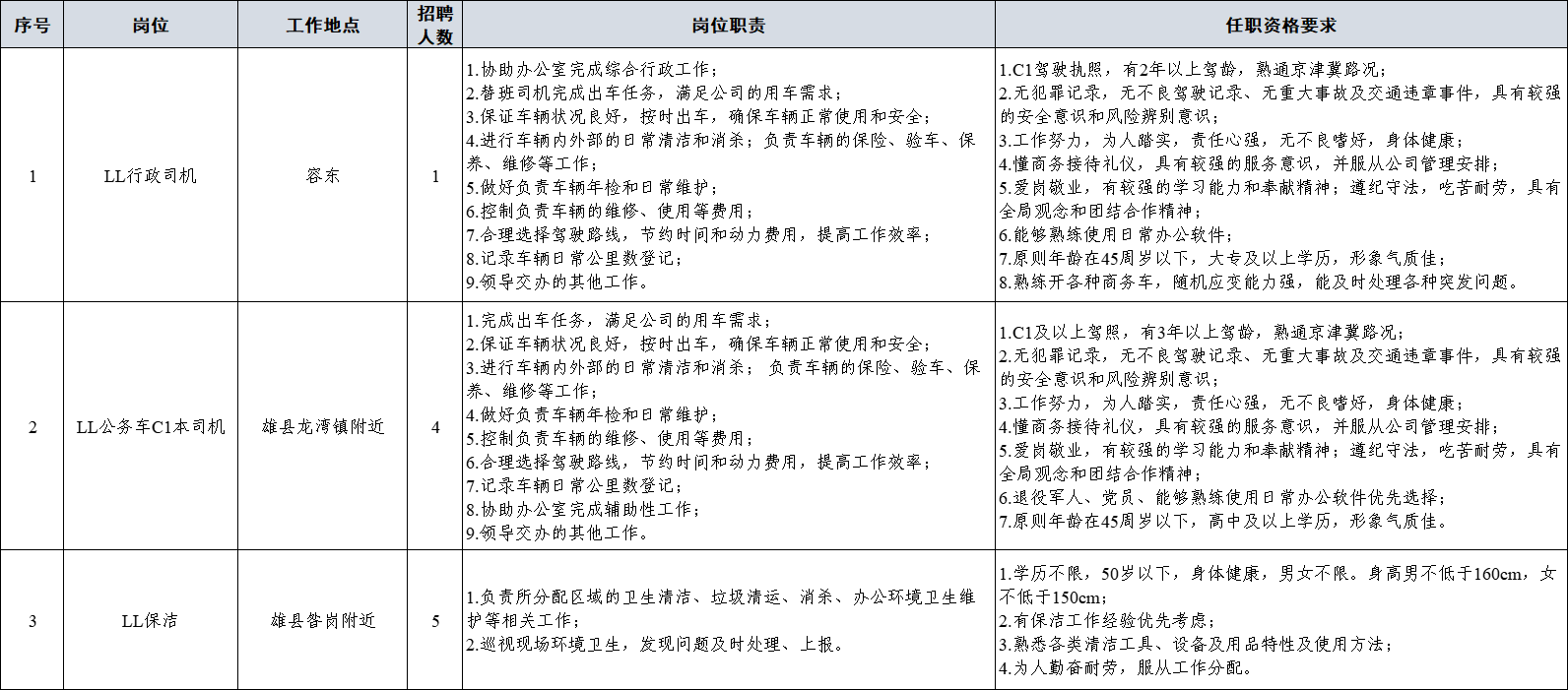 河北雄安人力資源服務(wù)有限公司(以下簡(jiǎn)稱(chēng)雄安人力公司)根據(jù)工作需要,現(xiàn)面向社會(huì)公開(kāi)招聘公務(wù)車(chē)C1本司機(jī)、行政司機(jī)、保潔崗位項(xiàng)目員工,工作地點(diǎn)在雄安新區(qū)。有關(guān)事項(xiàng)公告如下: