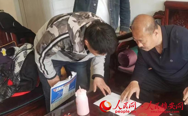 郵遞員在群眾家中指導(dǎo)不動產(chǎn)權(quán)利人填寫《領(lǐng)證單》。雄安新區(qū)自然資源和規(guī)劃局供圖