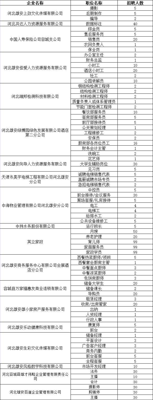 據(jù)了解,此次活動邀請河北雄安上勁文化傳媒有限公司、河北容城縣雄才偉略企業(yè)管理有限責任公司、河北瑞邦檢測科技有限公司等19家企業(yè),提供900余個用工需求。