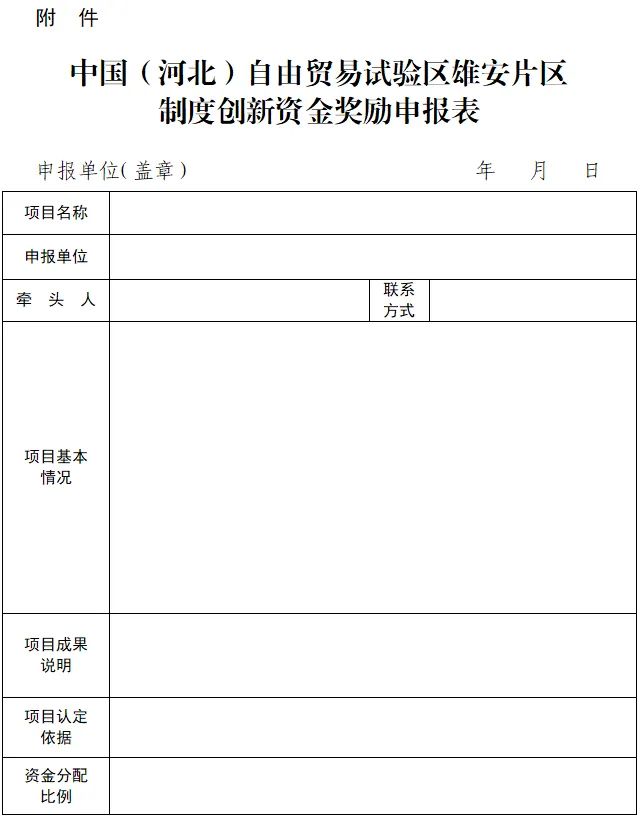 各創新主體應按照《辦法》填寫中國(河北)自由貿易試驗區雄安片區制度創新資金獎勵申報表,一項制度創新成果涉及多家單位的原則上應聯合申報,由牽頭單位組織統一申報。