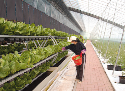 在黃灣村,還能采摘。離共享農場不遠,就是村里打造的現代農業產業園。玻璃溫室中,西紅柿等爬藤類蔬菜沿繩索生長,各類葉菜則長在栽培架上。