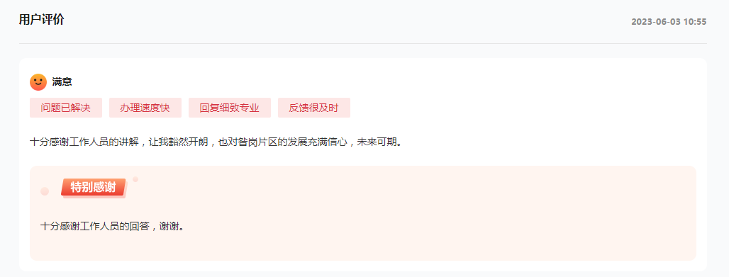 “工作人員的講解讓我豁然開朗,也對昝崗片區(qū)的發(fā)展充滿信心,感覺未來可期。”網(wǎng)友對該回復表示滿意,并對工作人員的回答作出感謝。