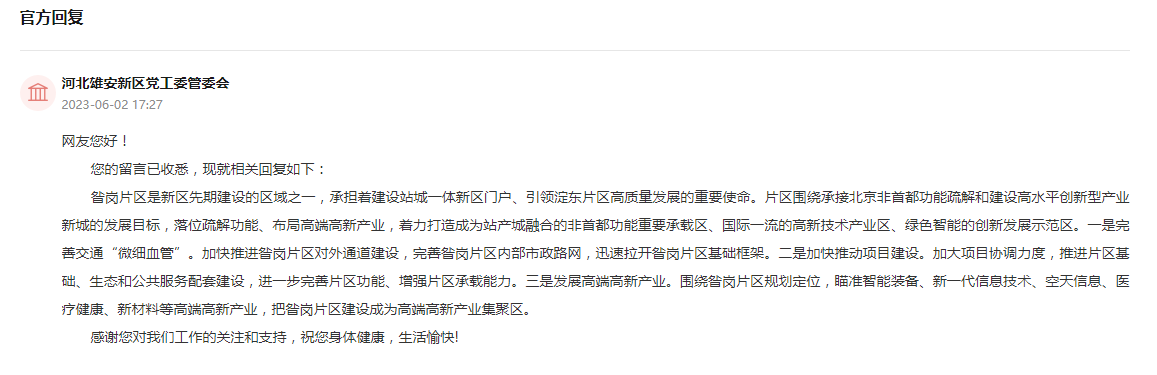 有回音|網(wǎng)友留言詢問雄安新區(qū)昝崗片區(qū)發(fā)展規(guī)劃 官方詳實回復獲點贊