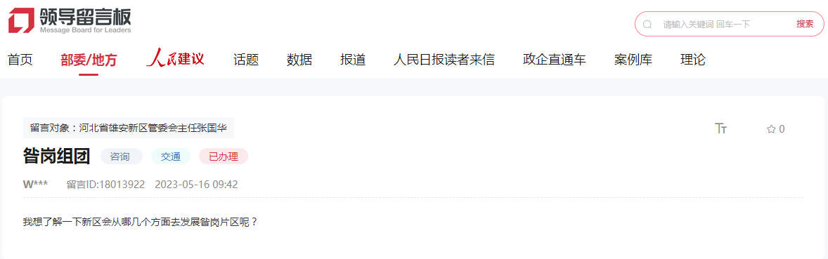 人民網(wǎng)雄安6月6日電 (王紅、劉師豪)“我想了解一下,雄安新區(qū)會從哪幾個方面去發(fā)展昝崗片區(qū)呢?”近日,有網(wǎng)友在人民網(wǎng)“領(lǐng)導留言板”留言,提出了這個問題。