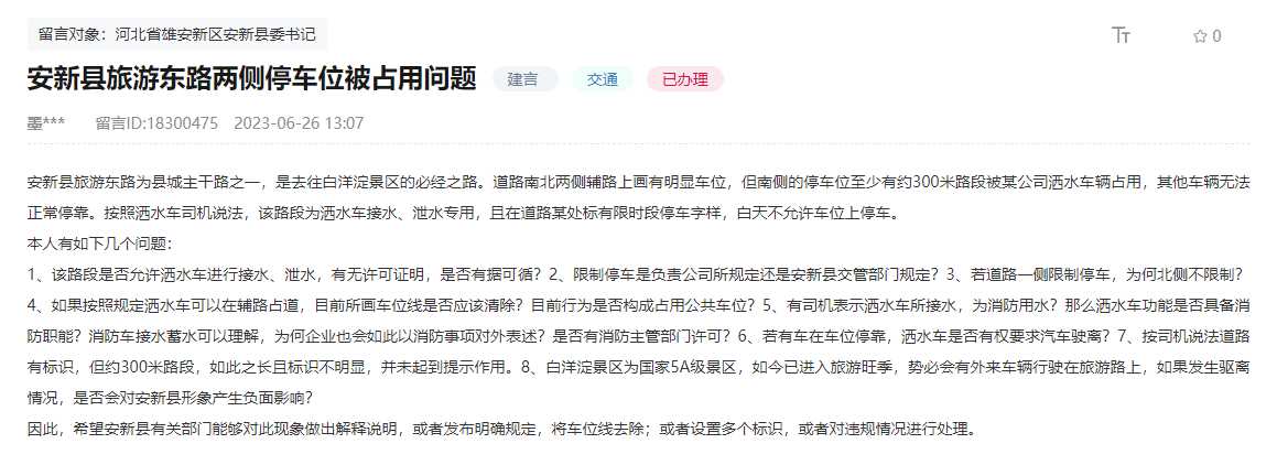 人民網雄安7月11日電 (記者李雪晴)“本想在路邊的停車位停車,卻被灑水車司機告知這個區域不能停車,只能供灑水車接水、泄水,這樣合理嗎?”日前,有網友在人民網“領導留言板”的“建言”一欄留言提出了自己的疑問。