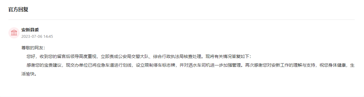 根據網友的留言,安新縣委在回復中表示,現交辦單位已將應急車道進行劃線,設立限制停車標志牌,并對灑水車司機進一步加強管理。