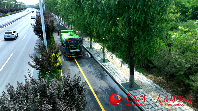 旅游東路相關路段已完成整改,圖為灑水車正在開“雙閃燈”接水。人民網 李兆民攝