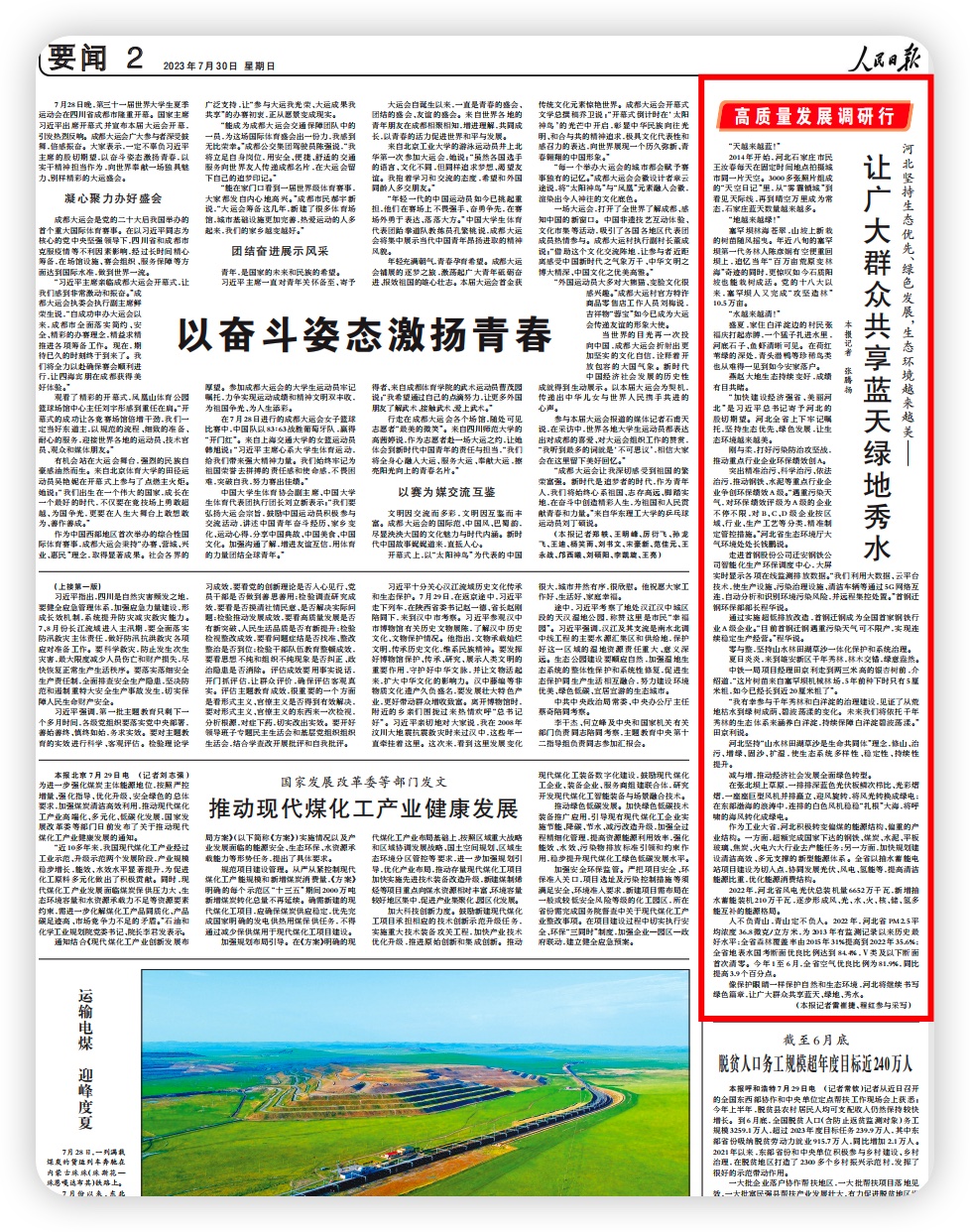 人不負(fù)青山,青山定不負(fù)人。2022年,河北省PM2.5平均濃度36.8微克/立方米,為2013年有監(jiān)測記錄以來歷史最好水平;全省森林覆蓋率由2015年31%提高到2022年35.6%;全省地表水國考斷面優(yōu)良比例達(dá)到84.4%,Ⅴ類及以下斷面首次清零。今年1至6月,全省空氣優(yōu)良比例為81.9%,同比提高3.9個百分點(diǎn)。
