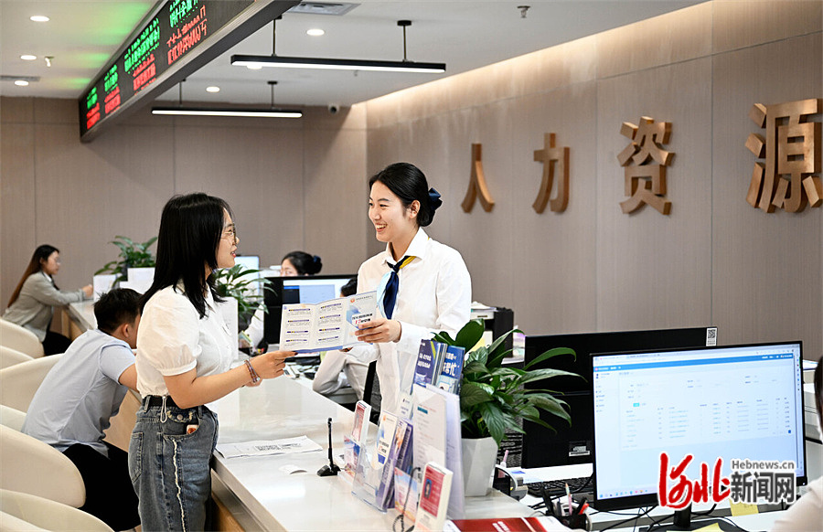 7月19日,雄安人力資源服務產業(yè)園工作人員(右)向辦事群眾介紹“雄才卡”的辦理手續(xù)。 河北日報記者 張 昊攝