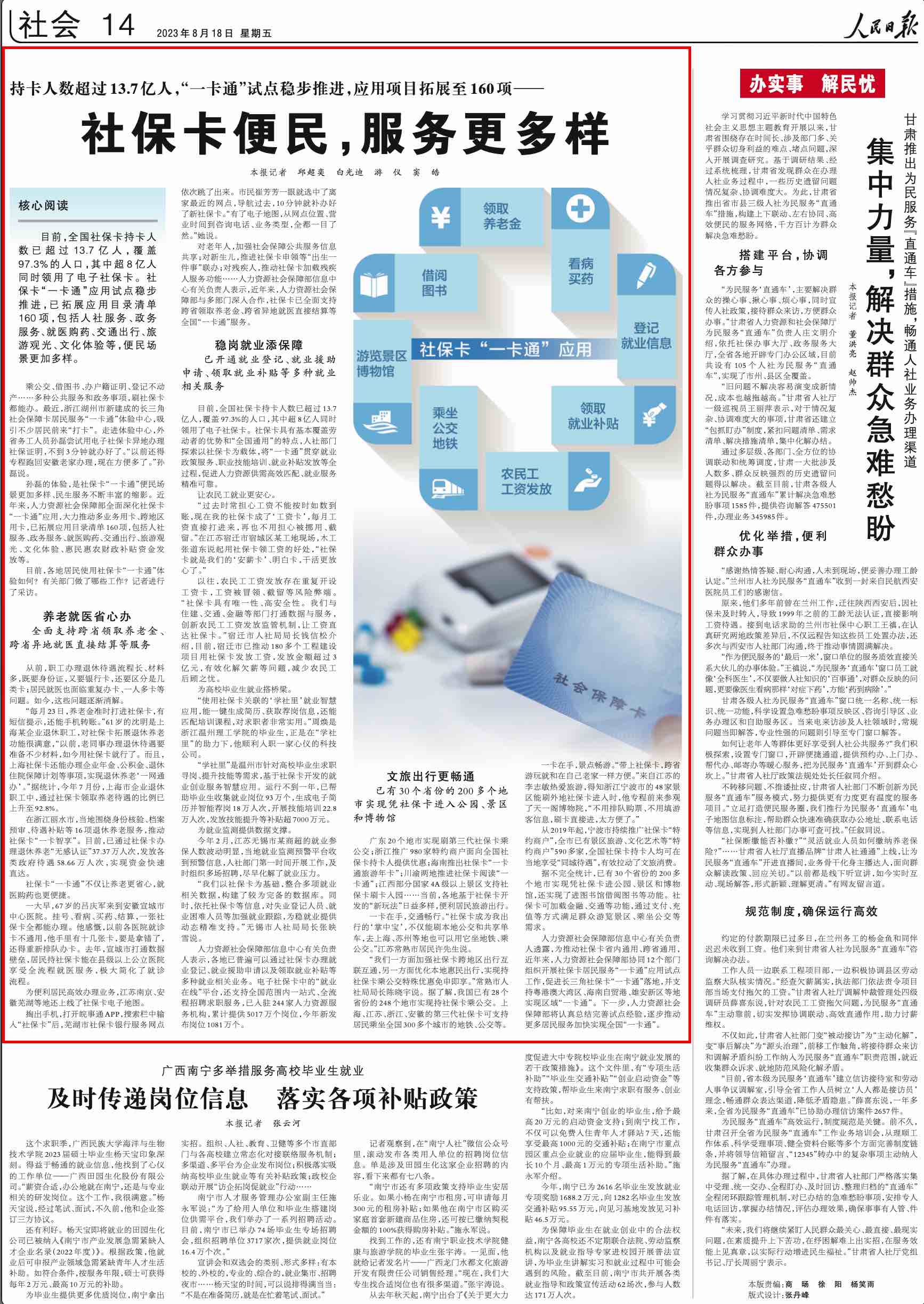 目前,全國社保卡持卡人數已超過13.7億人,覆蓋97.3%的人口,其中超8億人同時領用了電子社保卡。社保卡“一卡通”應用試點穩步推進,已拓展應用目錄清單160項,包括人社服務、政務服務、就醫購藥、交通出行、旅游觀光、文化體驗等,便民場景更加多樣。