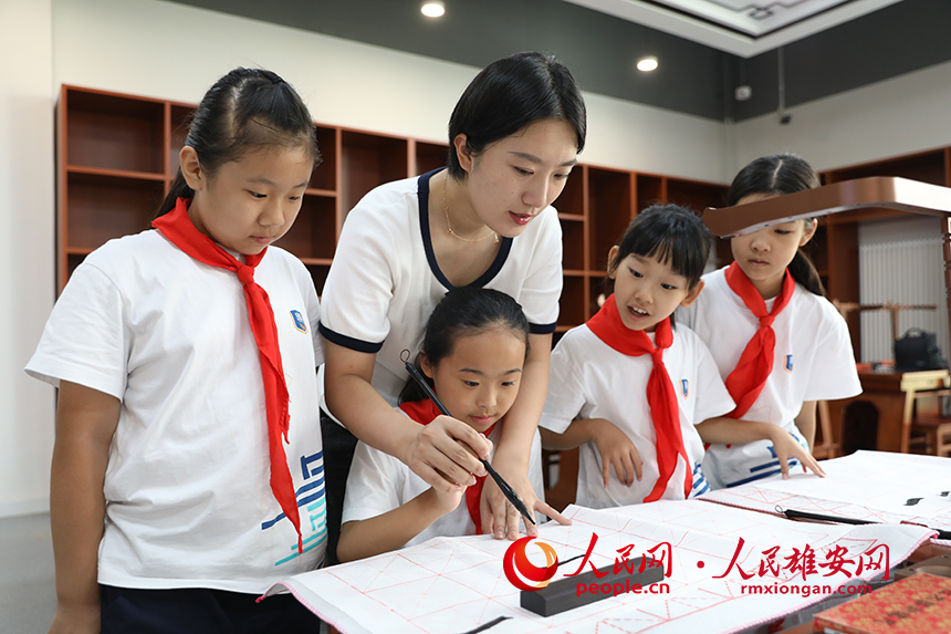 9月7日,雄安史家胡同小學教師正輔導學生書法。人民網 李兆民攝