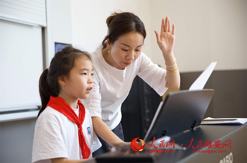 9月7日,雄安史家胡同小學音樂老師正輔導學生彈琴。人民網 李兆民攝