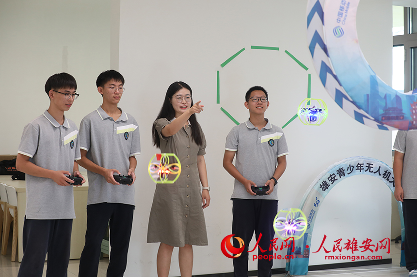 9月7日,北京市第八十中學雄安容東分校教師正在指導學生練習無人機對抗。人民網 李兆民攝