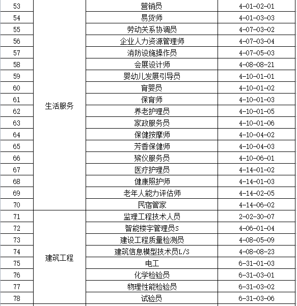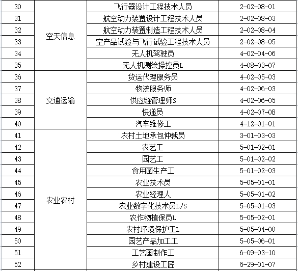 《目錄》采用《中華人民共和國職業分類大典(2022版)》分類標準,包括:能源管理工程技術人員、智能制造工程技術人員、工業互聯網工程技術人員等先進制造類職業(工種);人工智能工程技術人員、物聯網工程技術人員、大數據工程技術人員等數字經濟類職業(工種);飛行器設計工程技術人員、航空動力裝置設計工程技術人員、無人機駕駛員等空天信息類職業(工種);貨運代理服務員、物流服務師、汽車維修工等交通運輸類職業(工種);農藝工、園藝工、食用菌生產工等農業農村類職業(工種);營銷員、易貨師、勞動關系協調員等生活服務類職業(工種);監理工程技術人員、智能樓宇管理員、建設工程質量檢測員等建筑工程類職業(工種);政務服務辦事員、電子商務師、互聯網營銷師等勞務品牌類職業(工種)。