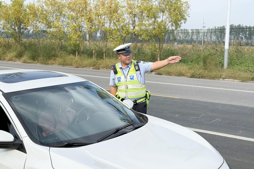 安新縣公安局交通管理大隊民警在白洋淀景區(qū)停車場路段巡邏時為外地牌照車輛指路。李若迪攝